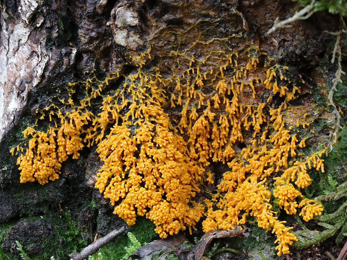 Badhamia utricularis ist eine häufige Schleimpilzart, die ein großes gelbes Plasmodium besitzt, das eigener Erfahrung nach gerne den Orangeroten Kammpilz (Phlebia radiata) überwuchert. Wenig später bilden sich Fruchtkörper, die in Trauben herabhängen und ihre Farbe von gelb später hin zu einem irisierenden Blaugrau ändern.