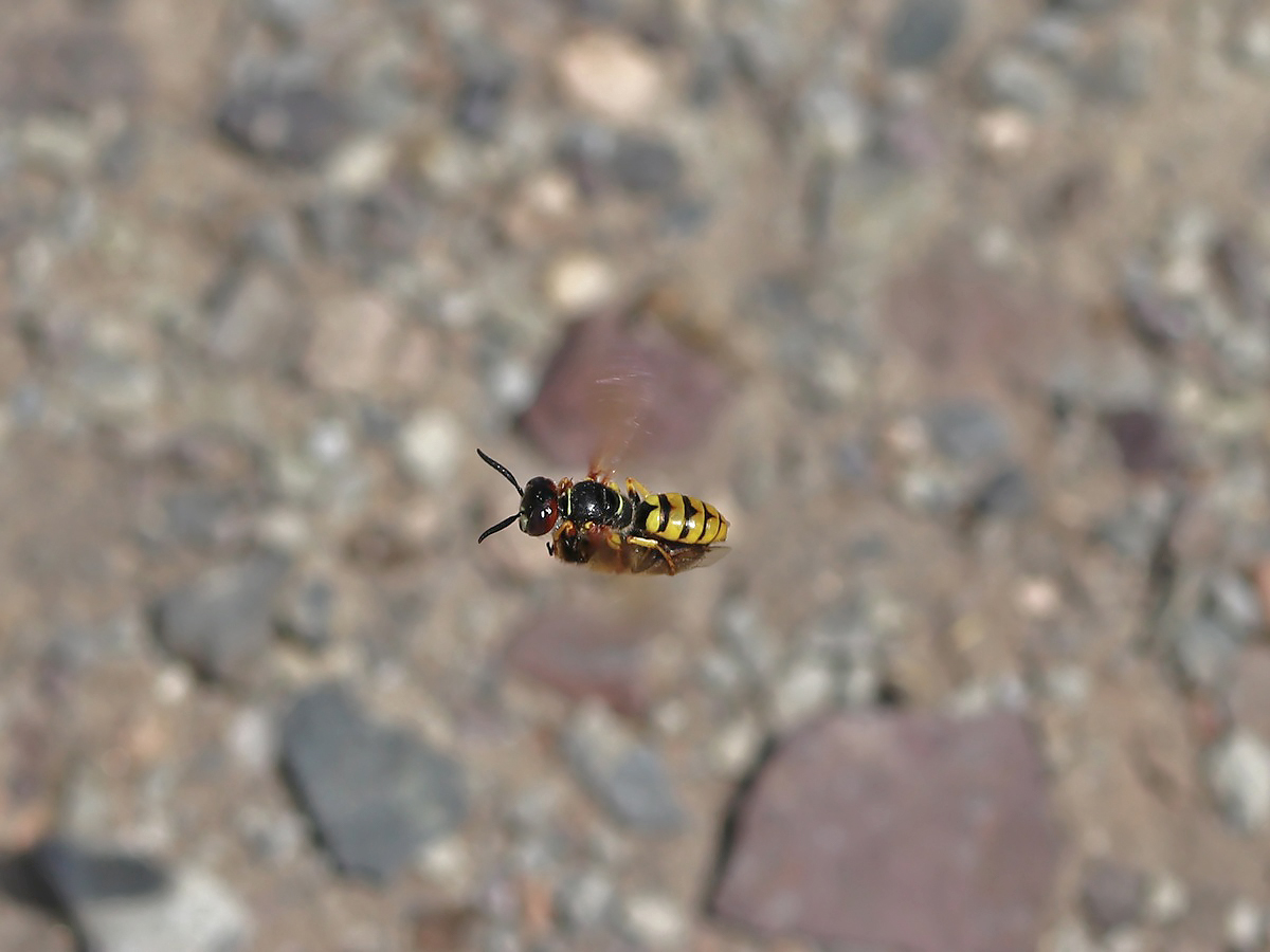 Der Bienenwolf (Philanthus triangulum) ist eine recht häufige Grabwespe, deren Larven sich von Bienen (hauptsächlich Honigbienen) ernähren. Er ist auf trockene, warme Böden angewiesen, in welche er seine Brutröhren graben kann. Typisch für diese Art sind u. a. die im Mittelteil dickeren Fühler sowie der an Schwebfliegen erinnernde schwirrende Flug.