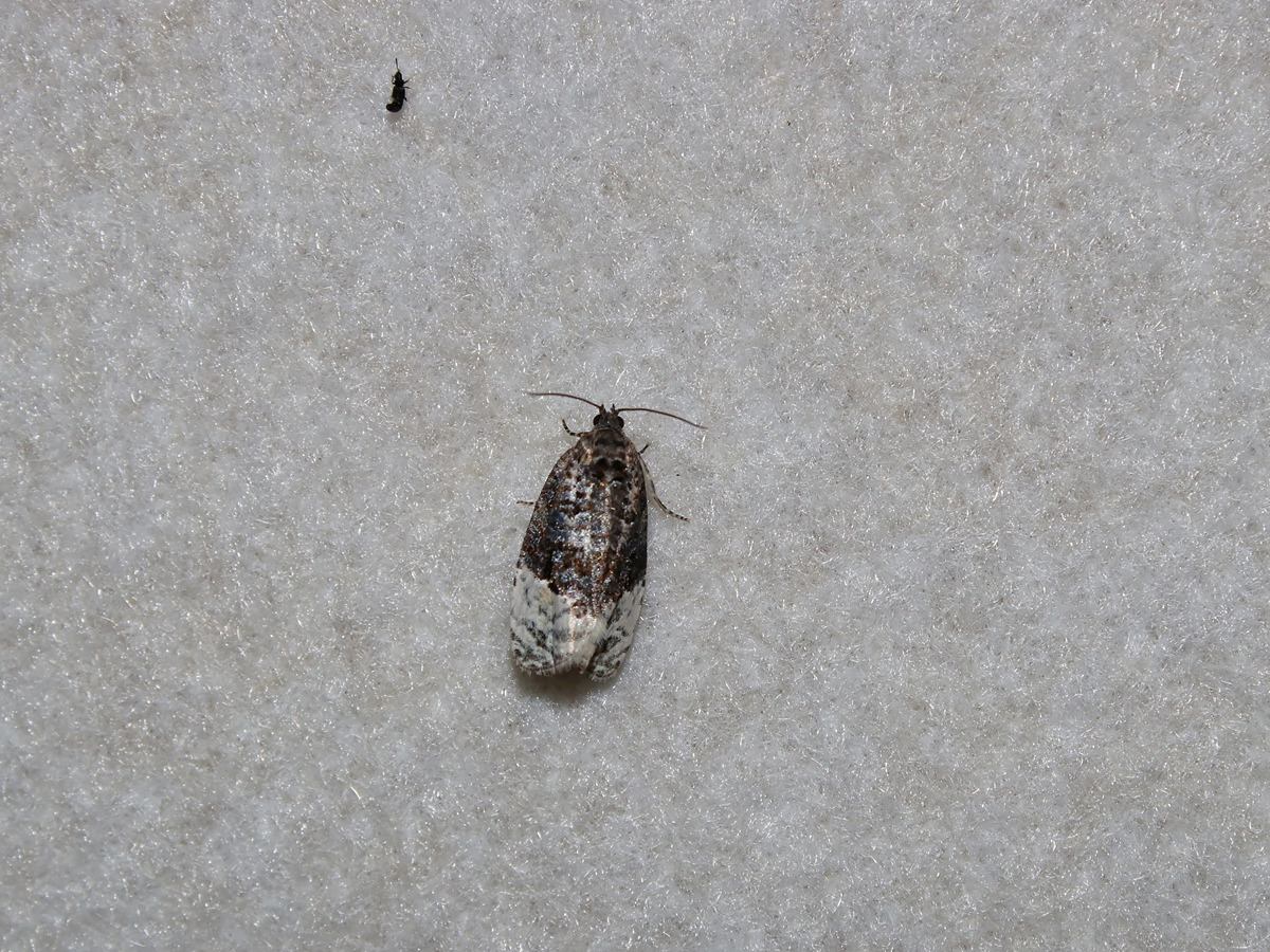 Der Birken-Knospenwickler (Apotomis betuletana) nutzt zwei zusammengesponnene Blätter einer Birke (Betula), um darin seine Raupen sich entwickeln zu lassen. Die häufige Art hat dunklere Vorderflügel mit weißlichen Flügelenden.