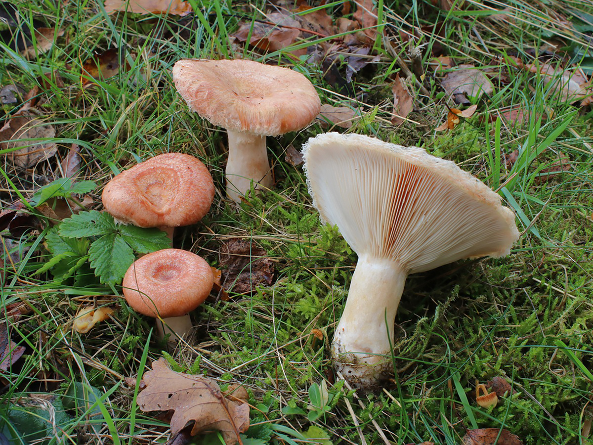 Der Birken-Reizker (Lactarius torminosus) ist ein häufiger Birkenbegleiter, der sich durch einen scharfen Geschmack, Rosatöne und konzentrische Ringe auf dem Hut auszeichnet. Letzteres unterscheidet diese Art auch vom Flaumigen Birken-Milchling (Lactarius pubescens), der ansonsten zahlreiche Merkmale teilt.