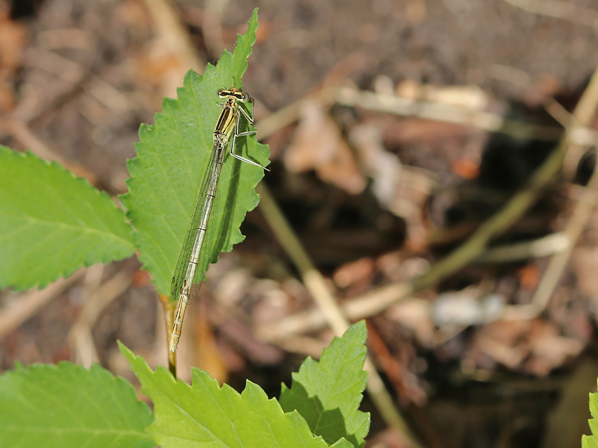 Die Blaue Federlibelle (Platycnemis pennipes) ist eine Kleinlibelle, deren Männchen bläulich sind und deren Weibchen weißlich-cremefarben, mitunter mit leicht grünlicher oder bläulicher Komponente gezeichnet sind. Die Art hat keine besondere Ansprüche an ihr das Gewässer zur Eiablage. Federlibellen könnten anhand der doppelten Antehumeralstreifen am Thorax gut von den Schlanklibellen wie der Hufeisen-Azurjungfer (Coenagrion puella) unterschieden werden.
