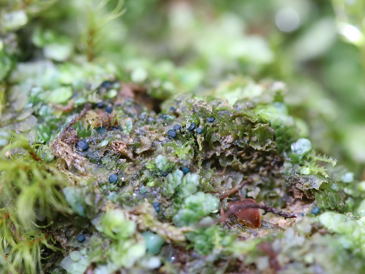 Der Blaue Lebermoosbecherling (Mniaecia jungermanniae) ist ein petrolfarbener wenige Millimeter kleiner Becherling, der im Frühjahr auf verschiedenen Arten folioser Lebermoose, u. a. der Gattung Calypogeia, wächst. Den Wirt findet man typischerweise (eigener Erfahrung nach) an halbwegs feucht liegenden Hängen neben Wegrändern in Laubwäldern.