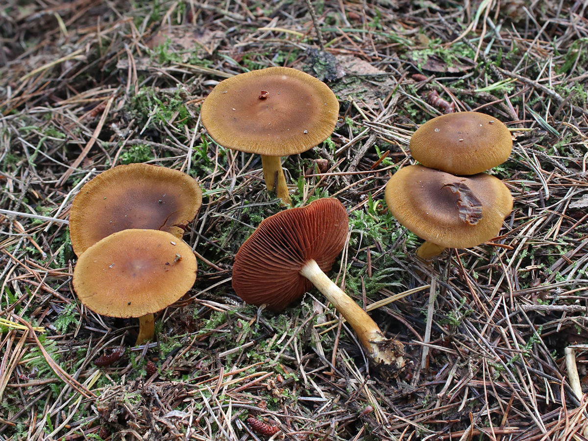 Der Blutblättrige Hautkopf (Cortinarius semisanguineus) zeichnet sich durch die kräftig rötlich gefärbte Fruchtschicht im Kontrast zur ockerbraunen bis gelben Hutfarbe aus. Es handelt sich um eine häufige Art saurer Nadelwälder, die zum Färben verwendet werden kann.