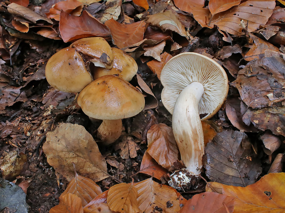 Der Brandige Ritterling (Tricholoma ustale) ist eine recht häufige Ritterlingsart, die sich durch schleimige und orangefärbte Hüte, große Fruchtkörper sowie den Wuchs bei Rotbuchen (Fagus sylvatica) auszeichnet. Die ähnliche Ritterlingsart Tricholoma ustaloides ist ein Eichenbegleiter mit bitterem Geschmack.