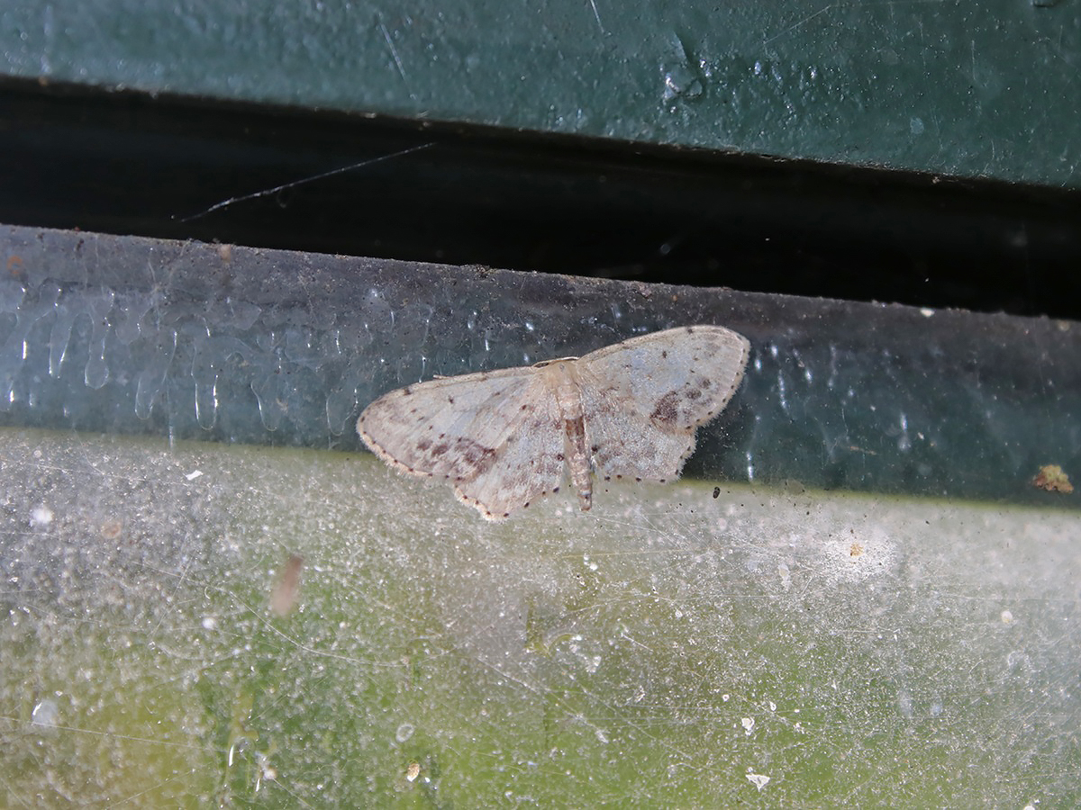Der Braungewinkelte Zwergspanner (Idaea dimidiata) besitzt eine einheitlich hellgraue Färbung mit mehreren schwärzlichen Schattierungen sowie Punkten, vor allem im Saumfeld. Es handelt sich um eine häufige Nachtfalterart, die feuchte Habitate bevorzugt.