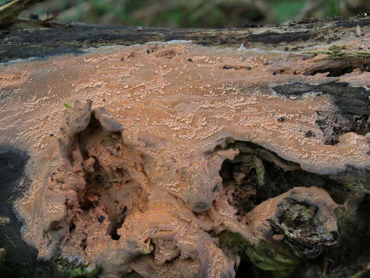 Bei Dichostereum effuscatum handelt es sich um einen eher seltenen Rindenpilz, der an Laubholz wächst und feuchte Standorte bevorzugt.