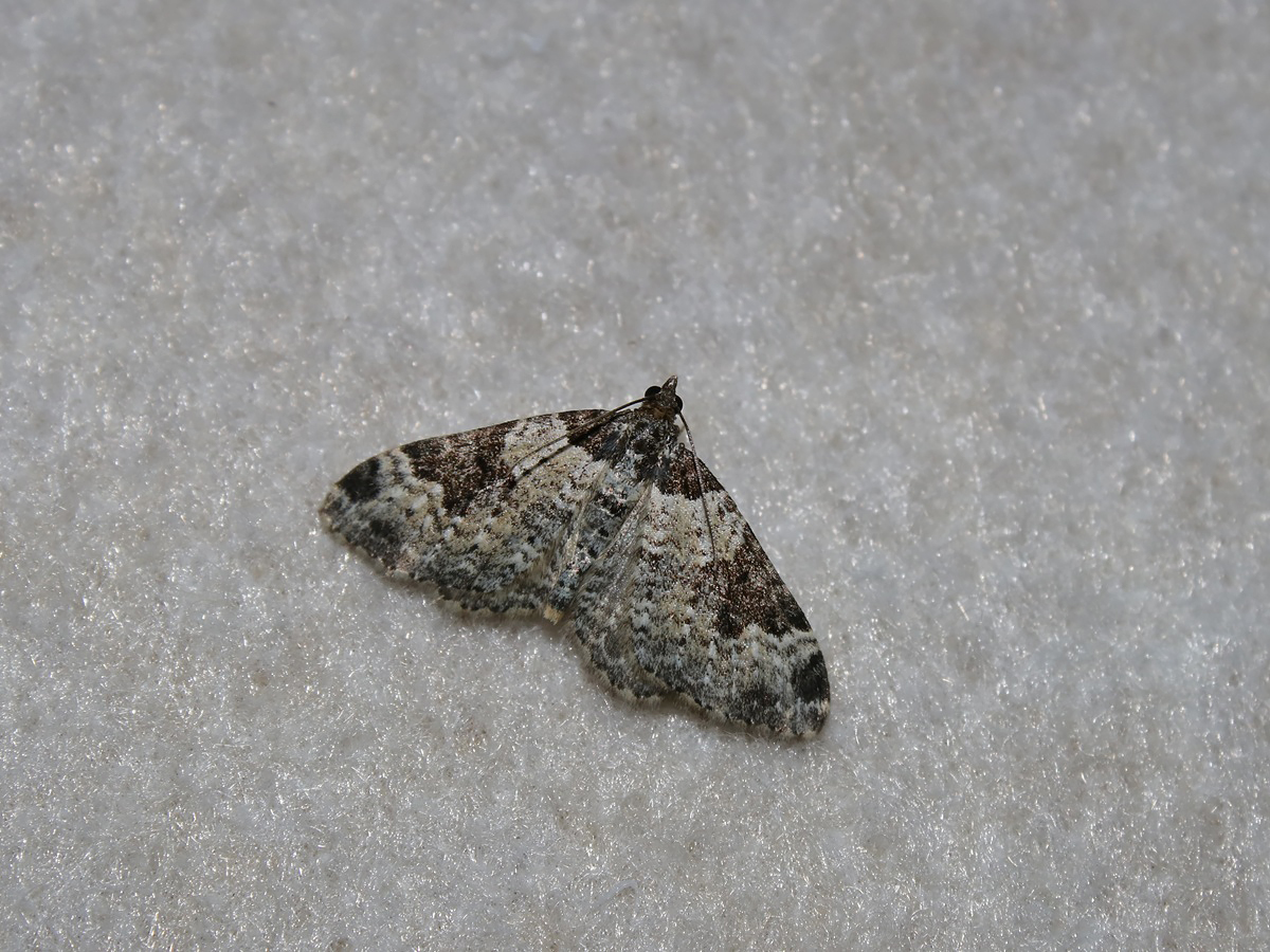 Der Garten-Blattspanner (Xanthorhoe fluctuata) verfügt über zwei typische dunkelbraune Flecken pro Flügel gegenüber der ansonsten hellgrauen Färbung. Diese häufige Art bildet zwei Generationen im Jahr.