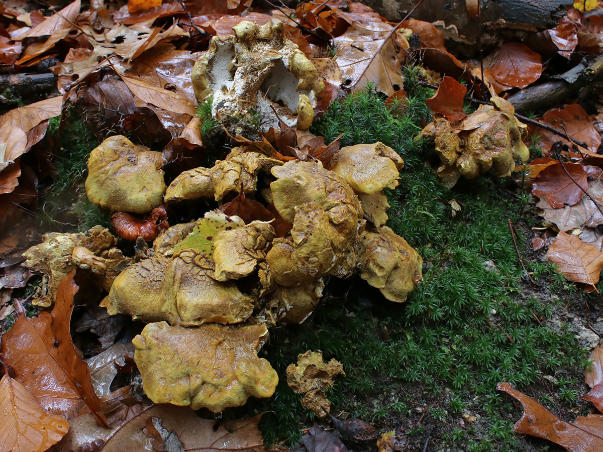 Der eher seltene Gelbgrüne Kamm-Porling (Albatrellus cristatus) wächst unter Laubbäumen und kann durch die Grüntöne von ähnlichen Porlingsarten unterschieden werden.