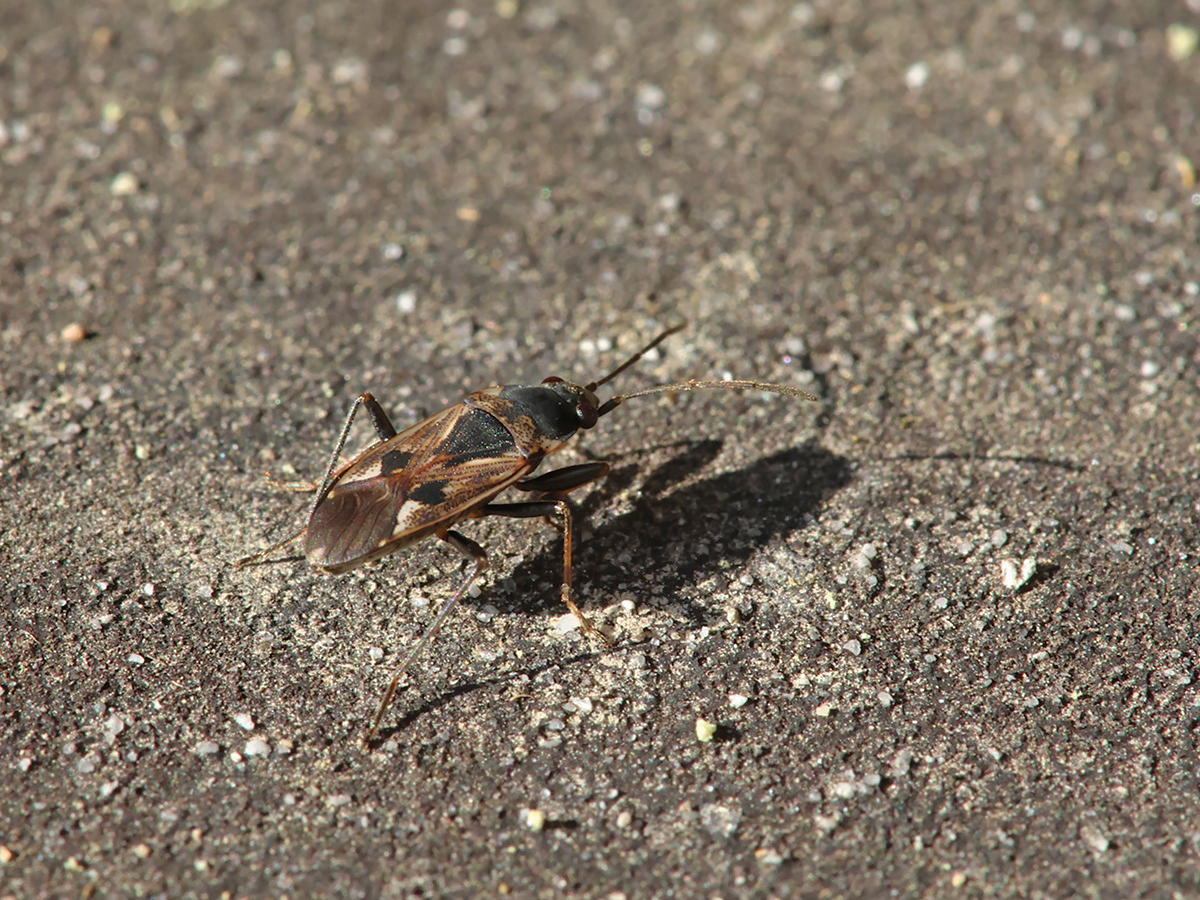 Bei der Gemeinen Bodenwanze (Rhyparochromus vulgaris) handelt es sich um eine weitverbreitete Art, die sich vor allem von Samen ernährt, die sie mit ihrem Stechrüssel ansticht. Der genaue Blick auf ihre Zeichnung ist artbestimmend.