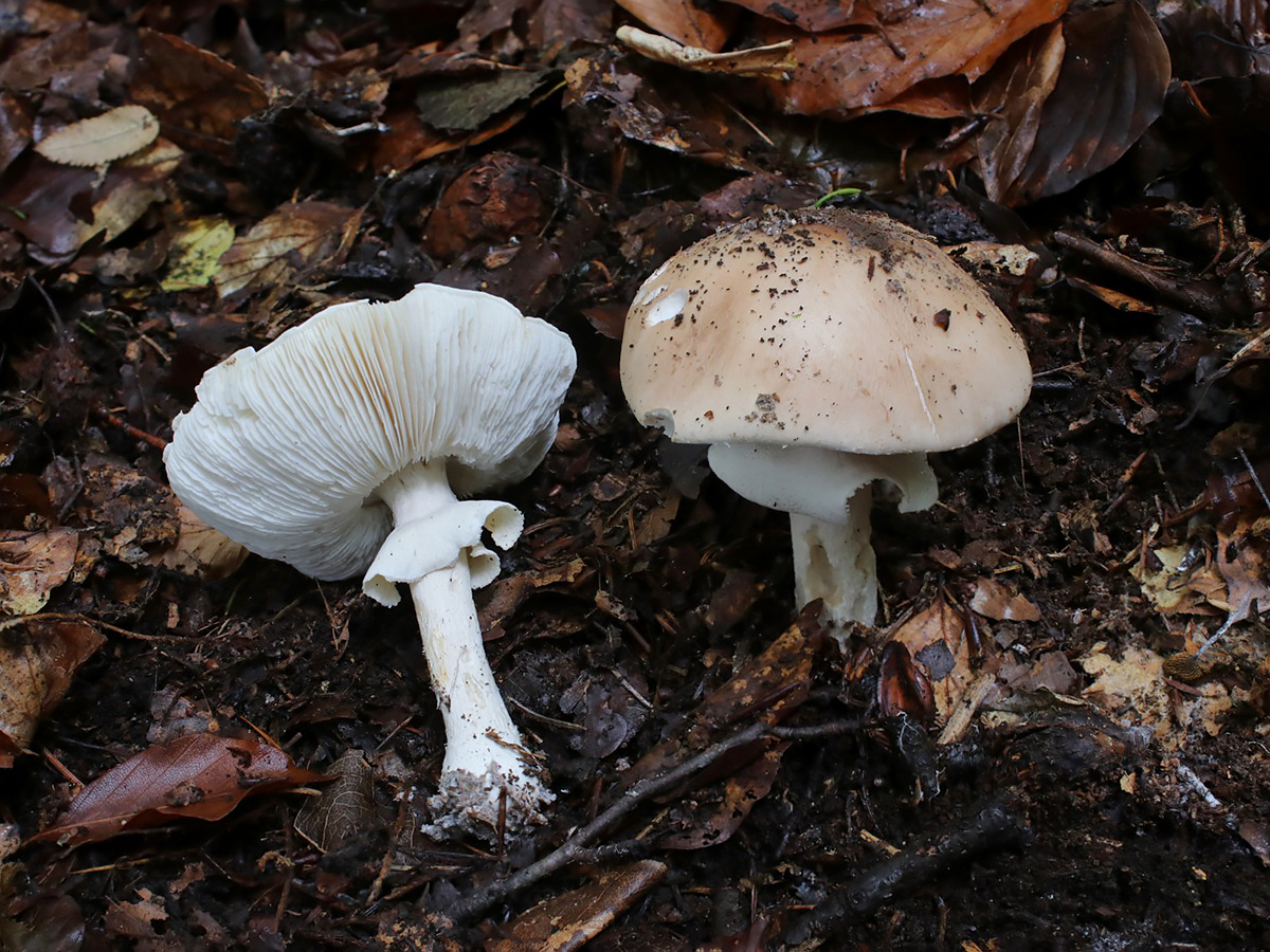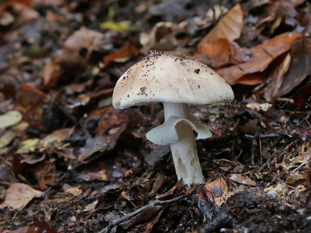 Der Getropfte Schleimschirmling (Limacella guttata) bevorzugt kalkhaltige Böden und ist nur bei feuchtem Wetter schleimig auf der Hutoberfläche. Typisch sind zudem die Tröpfchen am kräftigen Stielring sowie die recht einheitlich hellbräunliche Farbe.
