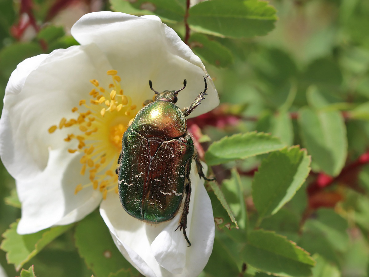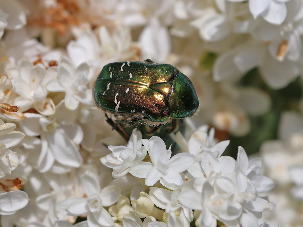 Der Goldglänzende Rosenkäfer (Cetonia aurata) ist ein großer und auffälliger Käfer, der im Flug fast hummelähnlich aussieht und klingt. Die immer wieder in großen Gruppen auftauchende Art unterscheidet sich durch die weißlichen Querstreifen sowie Flecken von ähnlichen Rosenkäfern.