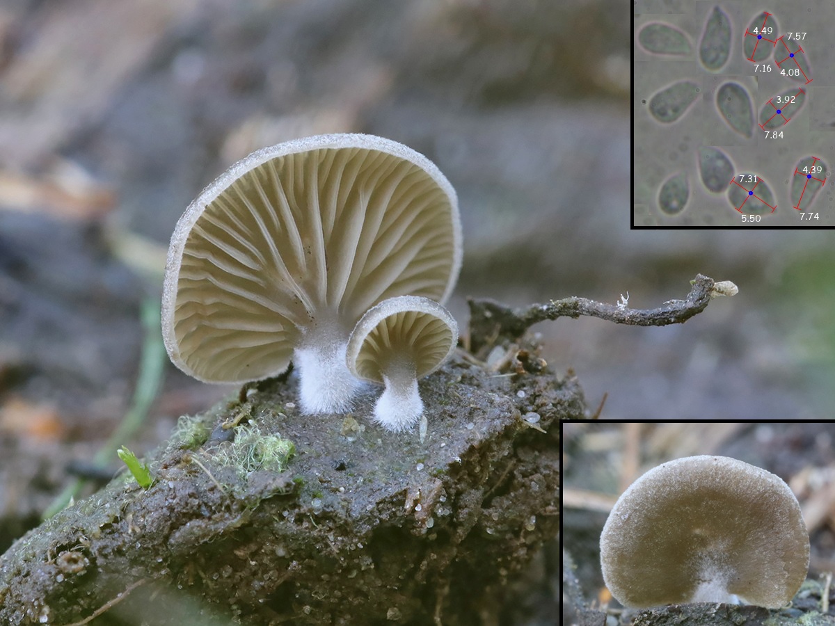 Der Graue Adermoosling (Arrhenia acerosa) zeichnet sich durch die graue Färbung sowie den meist seitlichen Wuchs aus. Beim Blick auf die Unterseite dieser eher seltenen Art offenbart sich ein i. d. R. kurzer, häufig weißfilziger Stiel.