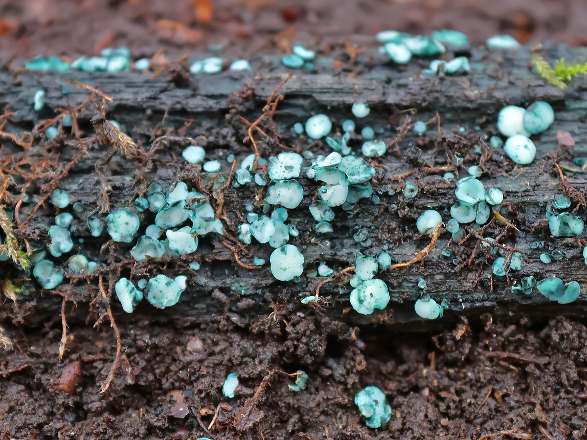 Der Großsporige Grünspanbecherling (Chlorociboria aeruginosa) ist eine seltene Art, die makroskopisch kaum vom deutlich häufigeren Kleinsporigen Grünspanbecherling (Chlorociboria aeruginascens) unterschieden werden kann. Die Sporengröße unterscheidet sich jedoch deutlich.