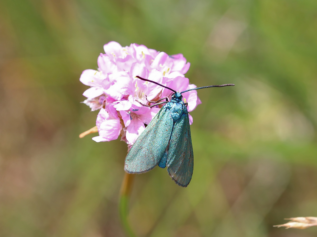 Das Grüne Ampfer-Widderchen (Adscita statices) ist ein tagaktiver Falter mit, je nach Abnutzung, grünen, grünblauen oder hellblauen Farbtönen. Die Art ist weit verbreitet, aber nicht extrem häufig. Meist ist sie nur in bestimmten Habitaten (Moore, Heiden, Feuchtgebiete, Feuchtwiesen) anzutreffen. Das Grüne Ampfer-Widderchen (Adscita statices) ist auf der Vorwarnliste der Roten Liste Deutschlands. Es lässt sich kaum von seinen Gattungsnachbarn unterscheiden, deshalb „cf.“.