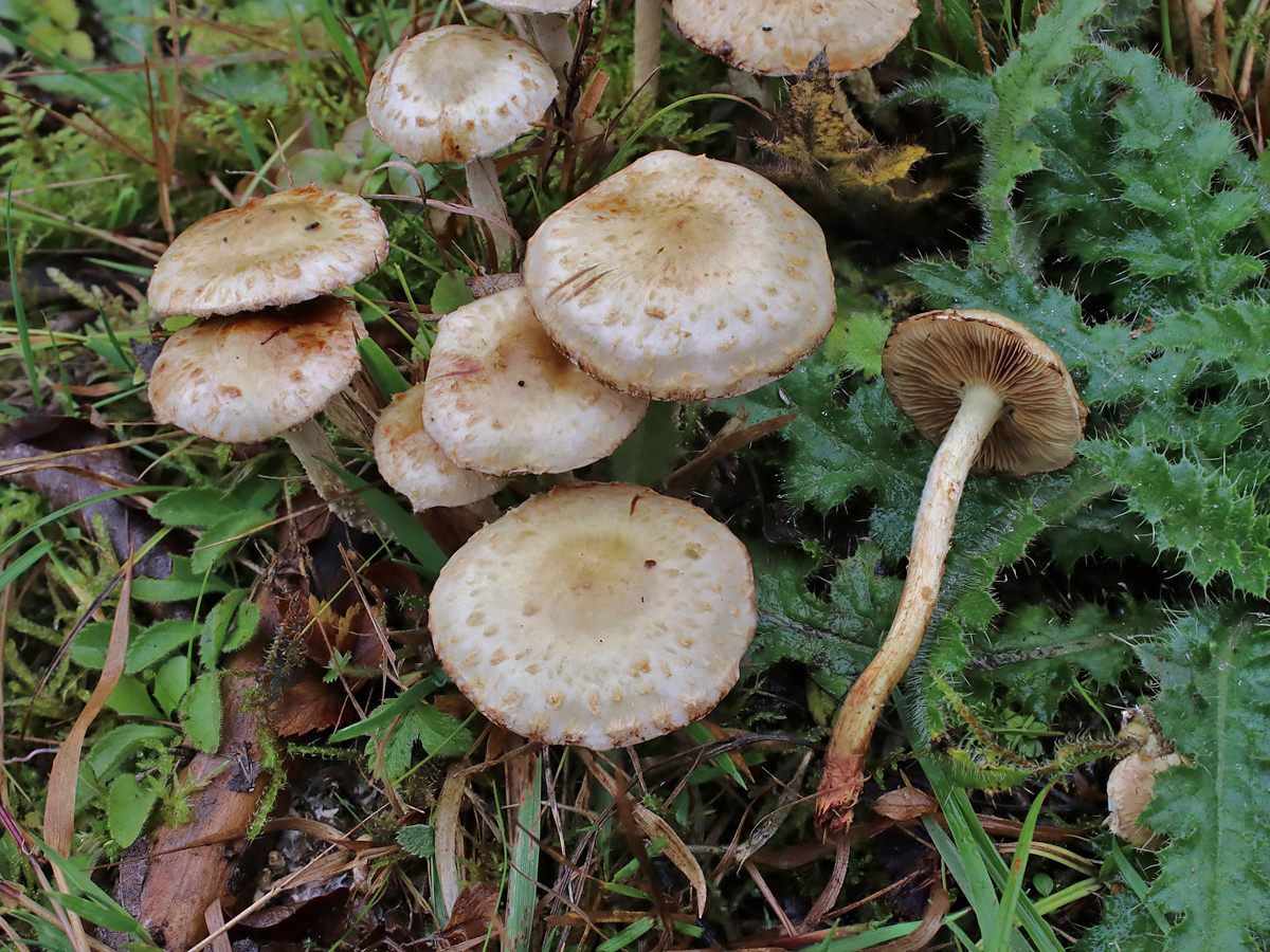 Der Gummi-Schüppling (Pholiota gummosa) ist eine recht häufige Wegrand-Art, die an vergrabenem Holz auf oder neben Waldwegen wächst. Typisch sind der büschelige Wuchs, die leicht schmierigen Hüte sowie die feinschuppigen Hüte mit mehr oder minder stark ausgeprägten Grüntönen.