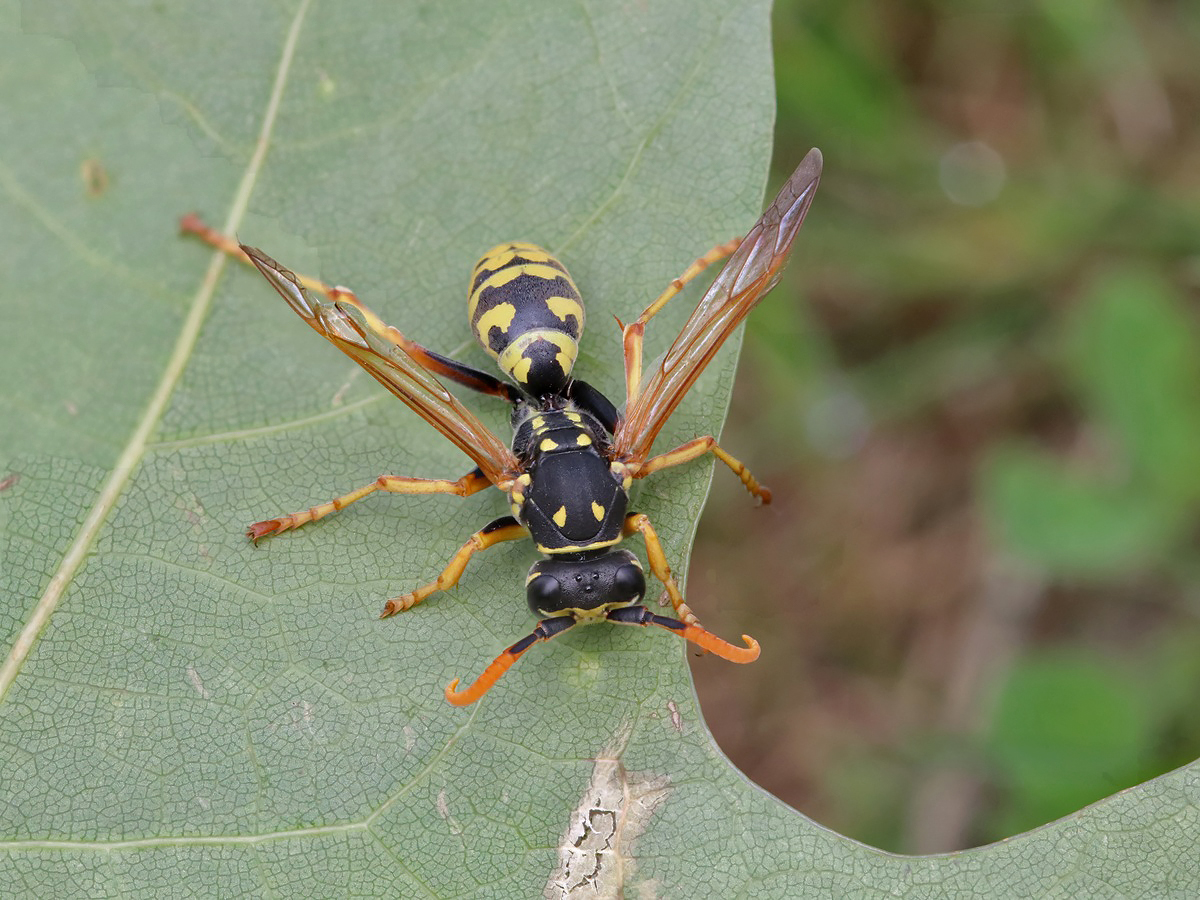 Die Haus-Feldwespe (Polistes cf. dominula), früher als Gallische Feldwespe bekannt, ist eine häufige Wespenart, die vor allem in offenen und trockenen Bereichen vorkommt. Im Flug lässt sie auffällig ihre Beine hängen. Unter anderem die Gesichtszeichnung unterscheidet diese Art von Gattungsnachbarn wie der Berg-Feldwespe (Polistes biglumis). Da diese Arten schwierig zu trennen sind, habe ich ein cf. ergänzt.