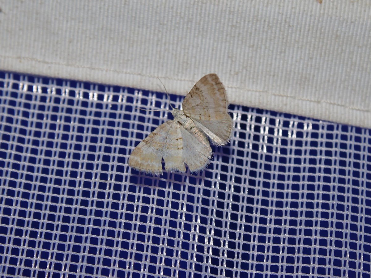 Der Klappertopf-Kapselspanner (Perizoma albulata) ist weißlich gefärbt mit diversen undeutlichen grauen bis hellbraunen Querbändern. Die Raupen dieser Art fressen Früchte von Klappertopf-Arten (Rhinanthus).