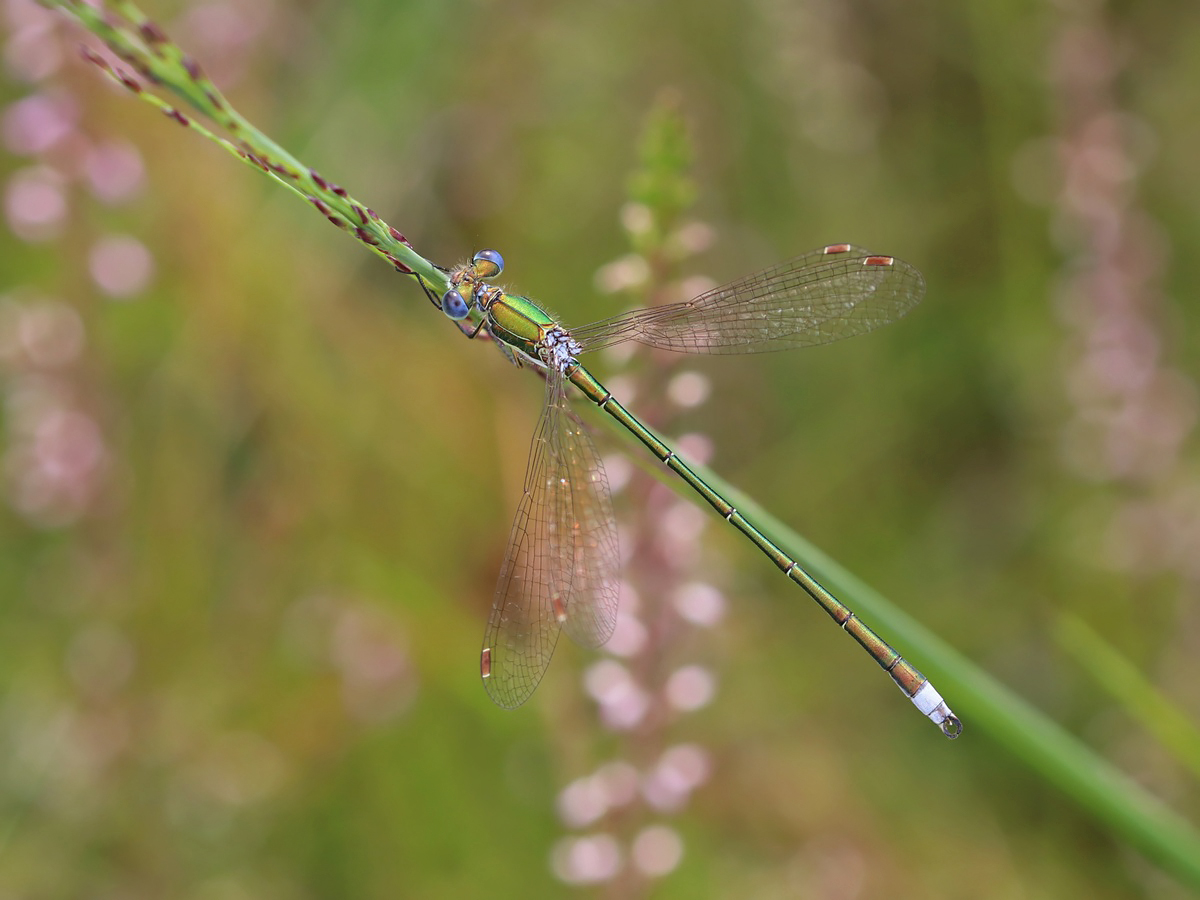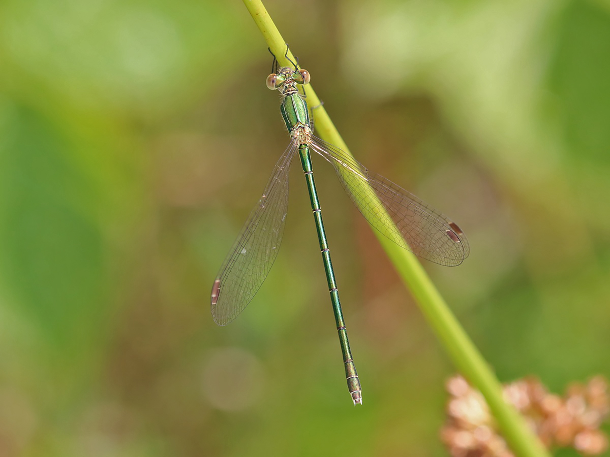 Die Kleine Binsenjungfer (Lestes virens) ist eine schmale Libellenart mit bräunlichem weißgerandeten Flügelmal, deren Weibchen heller grün gefärbt sind als die blauäugigen Männchen. Ihr typisches Habitat sind Moorgewässer sowie eher saure Weiher. Die ebenfalls recht häufige Gemeine Binsenjungfer (Lestes sponsa) besitzt schwarze Flügelmale.