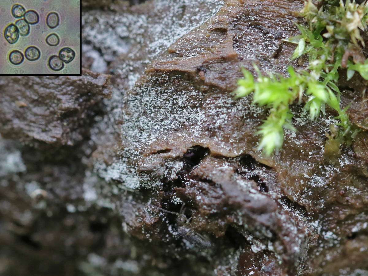 Der Körnchen-Rindenpilz (Bulbillomyces farinosus) ist eine häufige Art auf nassliegendem Totholz. Man erkennt die Art an den weißen runden (anamorphen) Körnchen bis 0,2 mm Durchmesser.