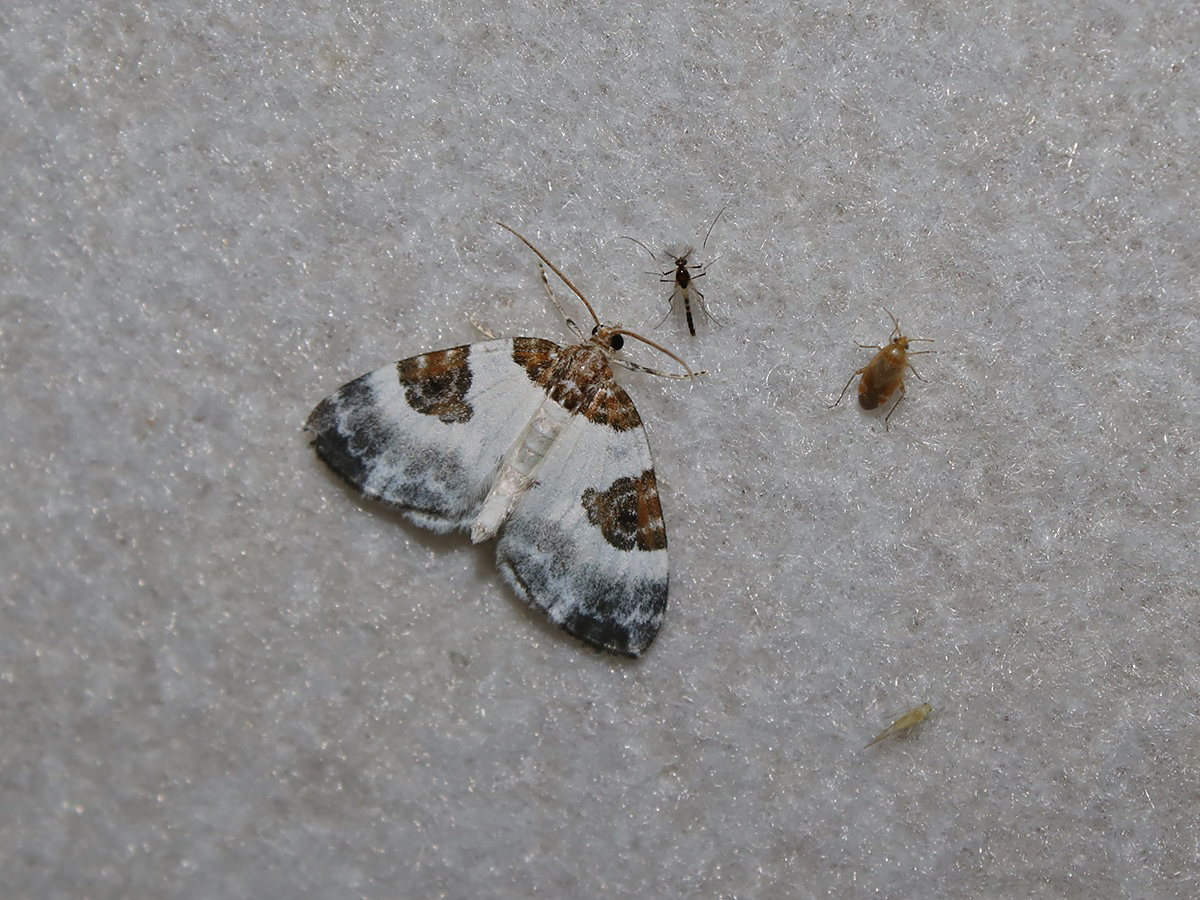 Der Milchweiße Bindenspanner (Plemyria rubiginata) weist eine weißliche Grundfärbung auf, die durch eine bräunliche Färbung am Flügelansatz sowie der Außenseite der Flügelmitte unterbrochen wird. Die häufige Art ist vor allem in heckenreichen Habitaten wie buschigem Offenland oder Gärten zu finden.