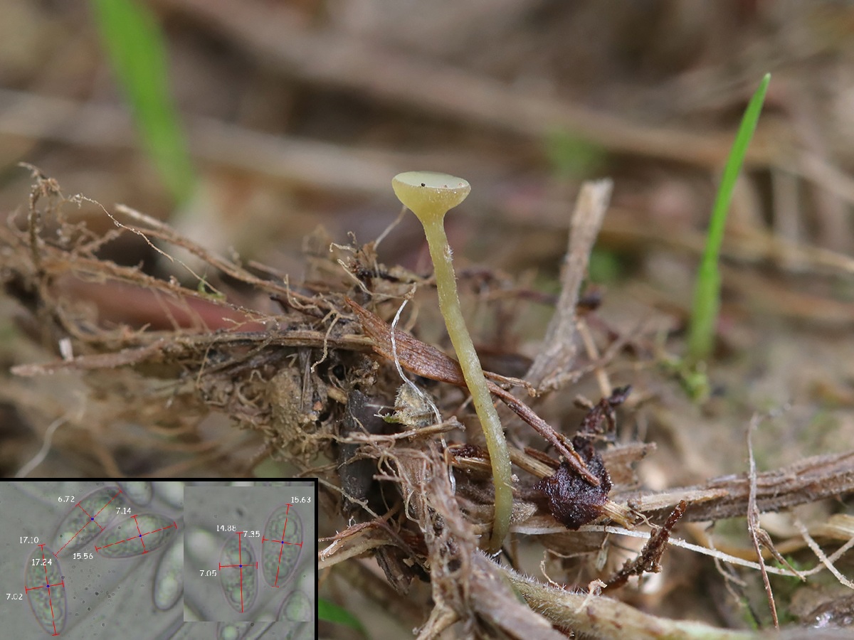 Der Ockergelbe Stromabecherling (Lanzia luteovirescens) besitzt eine gelbliche Farbe und ist auffallend lang gestielt. Typischerweise wächst er auf den Blattstielen von Ahornblättern und färbt diese schwärzlich. Bei dem gezeigten Fund war das Substrat nicht erkennbar und scheinbar wuchs kein Ahorn (Acer) in der Nähe, aber laut verschiedene Literatur sind auch andere Substrat möglich.