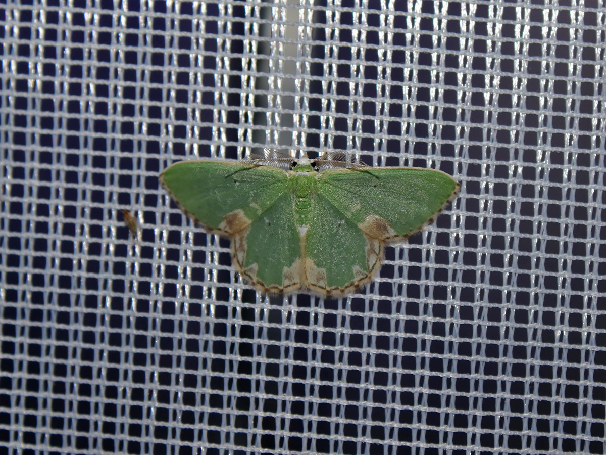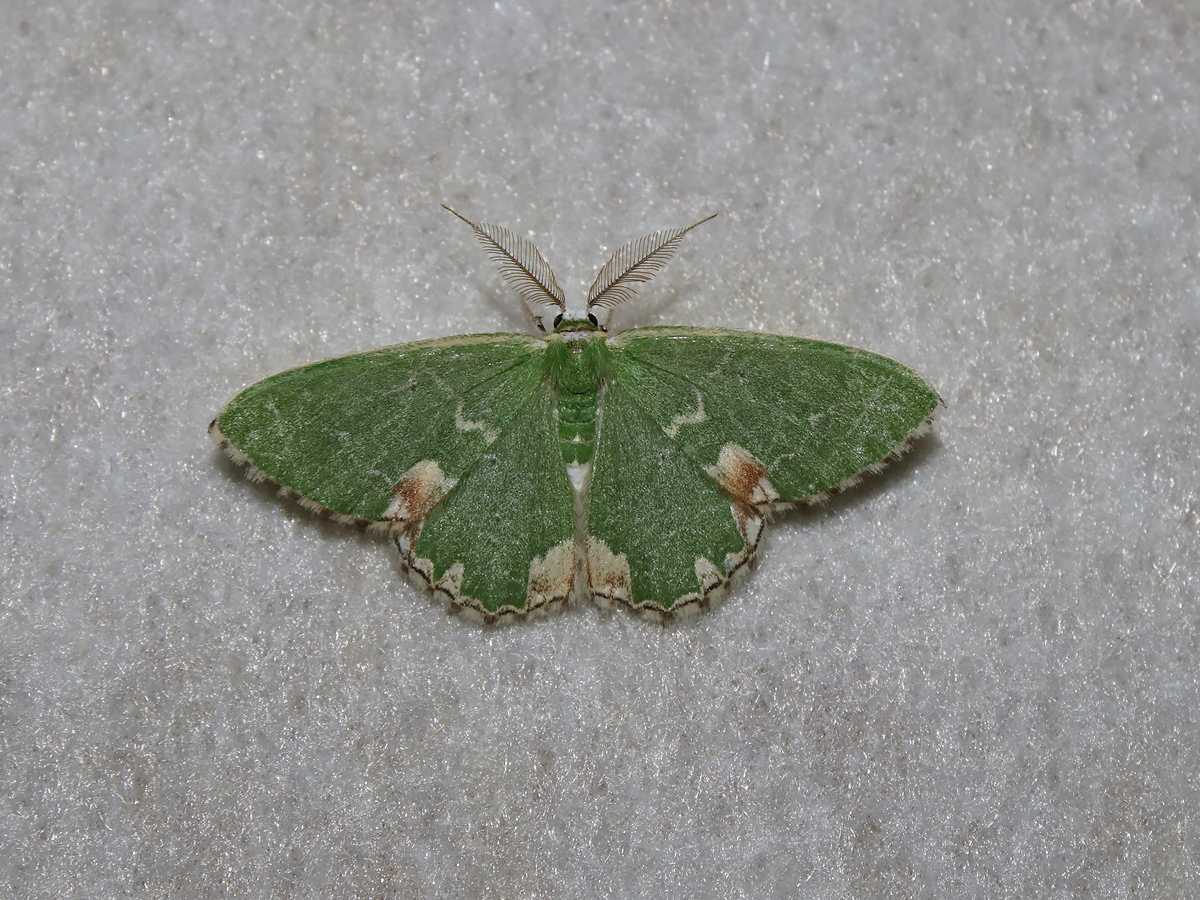 Der Pustelspanner (Comibaena bajularia) besitzt eine sattgrüne Färbung, während sich an den Innenwinkeln der Flügel sowie an den Flügelenden eine beigefarbene Zeichnung befindet. Die Art ist vor allem in der Nähe von Eichen (Quercus) zu finden.