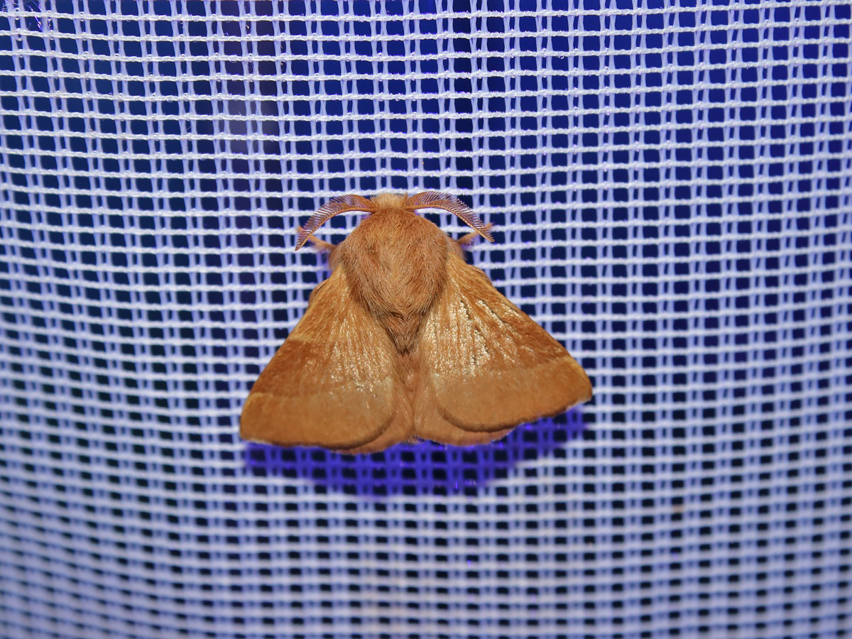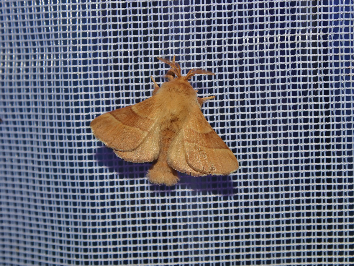 Der Ringelspinner (Malacosoma neustria) kann hellbraun bis kräftig bräunlich gefärbt sein, weist zwei mehr oder weniger deutliche Querbinden auf und ist insgesamt sehr haarig. Die Männchen dieser über die Jahre seltener gewordenen Art verfügt über stark gekämmte Fühler.