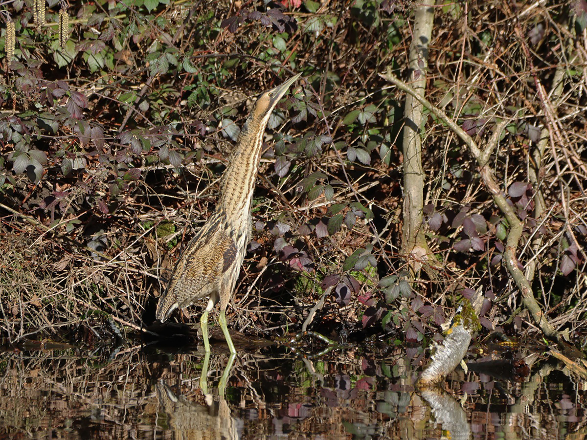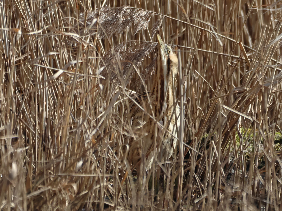 Die Rohrdommel (Botaurus stellaris) ist ein in großflächigen Schilfgebieten lebender Reiher, der mit etwa einigen hundert Brutpaaren in Deutschland als sehr selten gilt. Die in der Regel versteckt lebende, fast ausschließlich dämmerungs- und nachtaktive Art ist während der Balzzeit an den dumpfen Rufen zu erkennen, die ihr u. a. den Spitznamen Moorochse bescherten. Bei möglicher Gefahr nimmt die Rohrdommel (Botaurus stellaris) zwecks Tarnung eine Pfahlstellung ein.