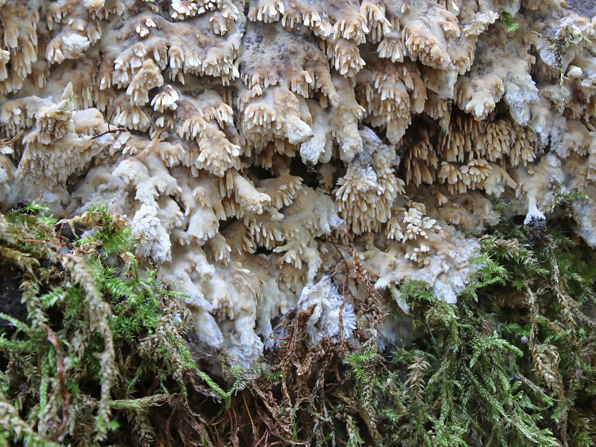 Der Scheinbuchen-Fadenstachelpilz (Phlebia nothofagi) ist ein auffallend angenehm fruchtig (birnenartig) riechender Porling, der an totem Laubholz wächst. Neben dem eindrücklichen Geruch unterscheidet auch die Farbverteilung der Stacheln (heller am Ende) sowie deren ungleiche Breite diese Art von Gattungsnachbarn wie etwa den Wachsgelben Fadenstachelpilz (Phlebia uda).