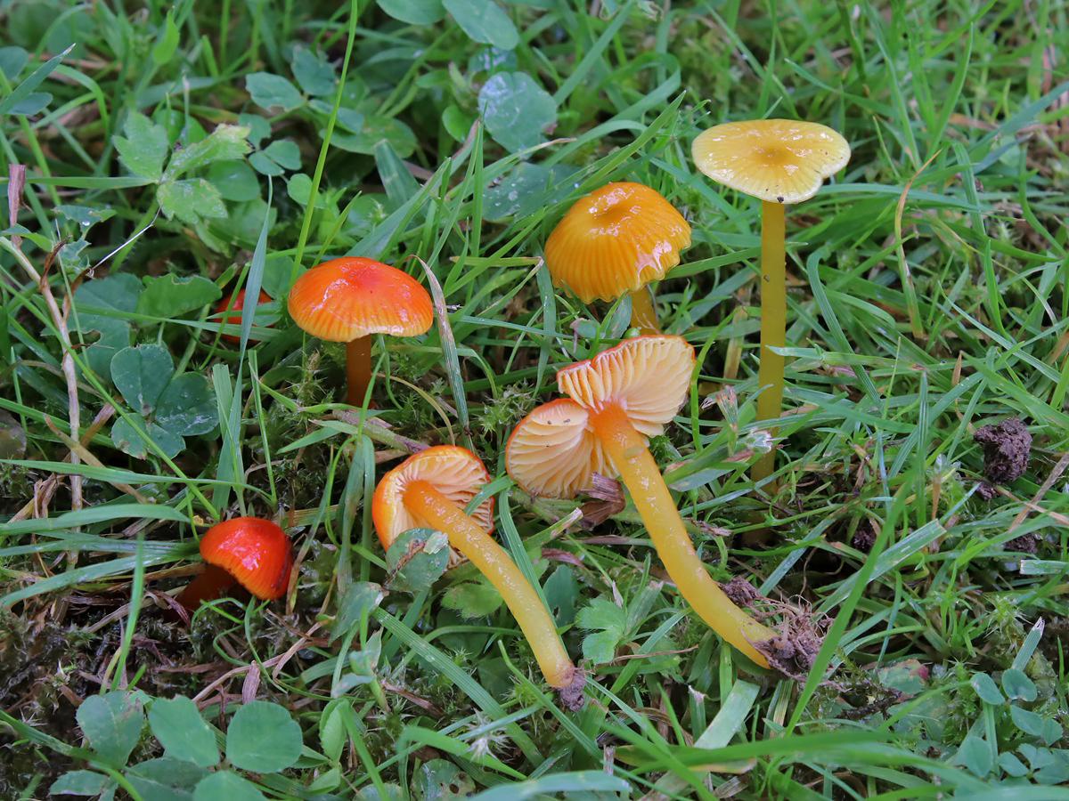 Der Schleimfuß-Saftling (Hygrocybe glutinipes) zeichnet sich durch den sehr schleimigen Stiel und Hut aus. Die gelb bis orange gefärbten Pilze weisen angeheftete bis leicht herablaufende Lamellen auf.