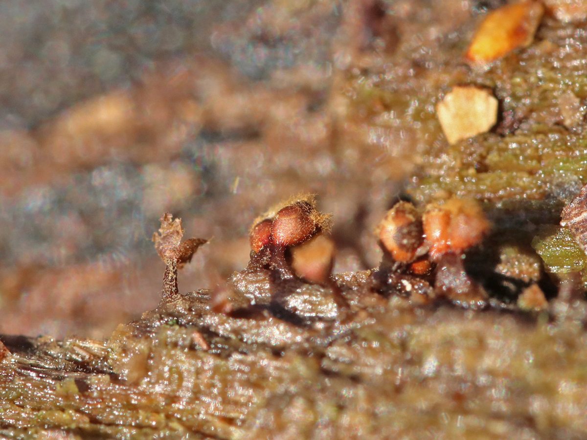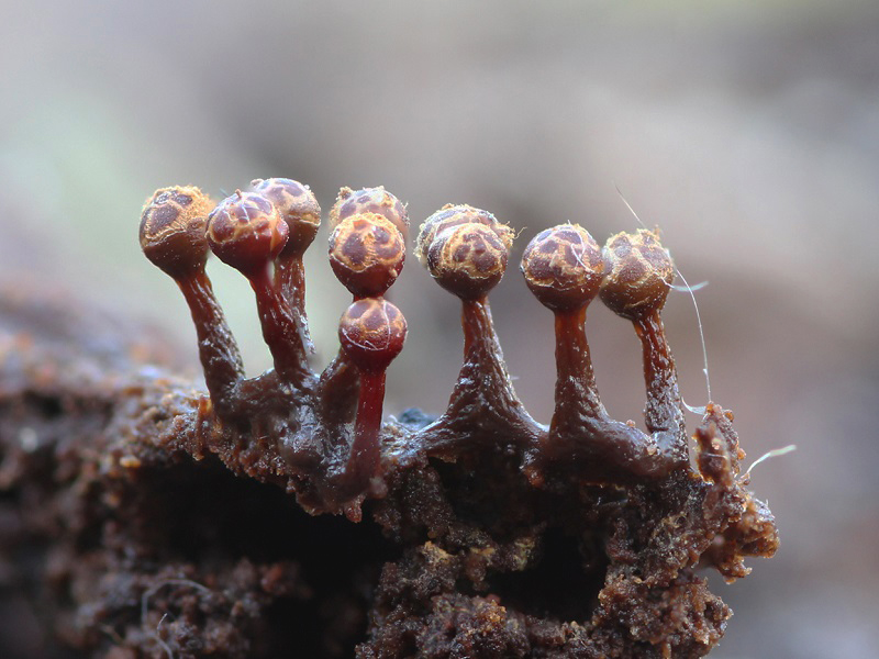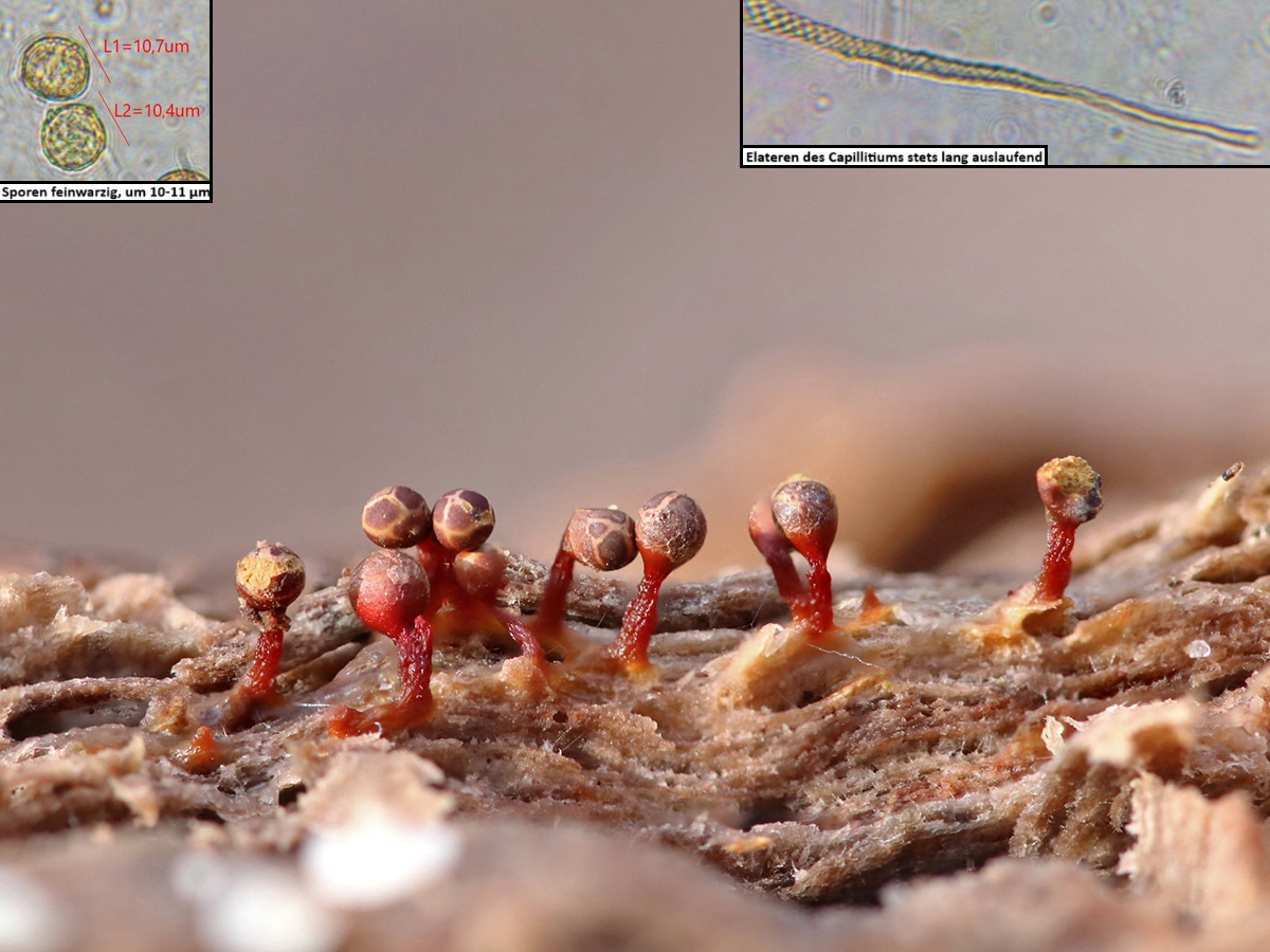 Trichia botrytis ist eine mittelhäufige Schleimpilzart, die sich durch die violettlich-irisierende bis schwärzlichen Fruchtkörper mit rötlichen Stiel auszeichnet, die gerne feldrig aufbrechen und das Trichia-typische gelbe Capillitium freigeben. Die Kombination aus recht kleinen feinwarzigen Sporen sowie langen Elateren (Enden des Capillitiums) dient der mikroskopischen Absicherung.