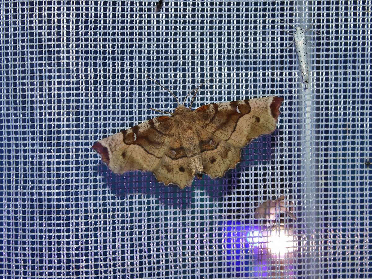 Der Violettbraune Mondfleckspanner (Selenia tetralunaria) besitzt auf der Oberseite der Vorderflügel jeweils einen weißlichen Fleck, der an eine Mondsichel erinnert. Es handelt sich um eine recht häufige Art, die in ihrer Ruheposition eher seltener ihre Flügel komplett aufspannt.