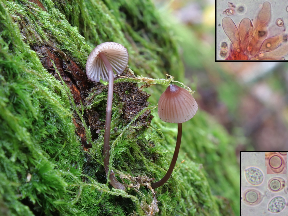 Der Violettschneidige Helmling (Mycena purpureofusca) ist ein Folgezersetzer auf Nadelholz, der sich durch die violettliche Färbung auszeichnet, die auch auf den Lamellenschneiden zu sehen sind. Der Farbton unterscheidet die Art schon makroskopisch von rötlichschneidigen Arten wie dem Purpurschneidigen Blut-Helmling (Mycena sanguinolenta).