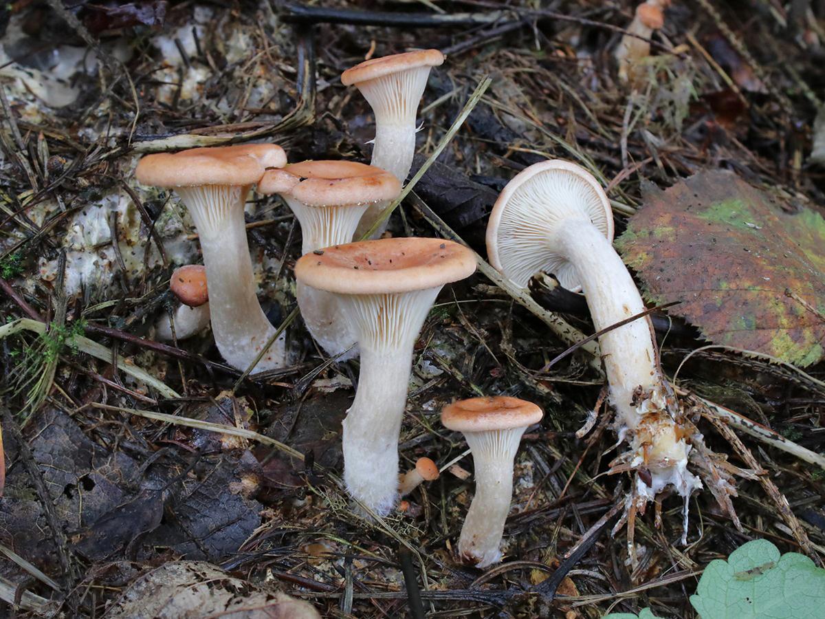 Der Wasserfleckige Röteltrichterling (Lepista gilva) ist eine recht häufige Art, die dem Fuchsigen Röteltrichterling (Lepista flaccida) ähnelt, aber insgesamt etwas blasser und kleiner ist sowie Wasserflecken am Hutrand aufweist.