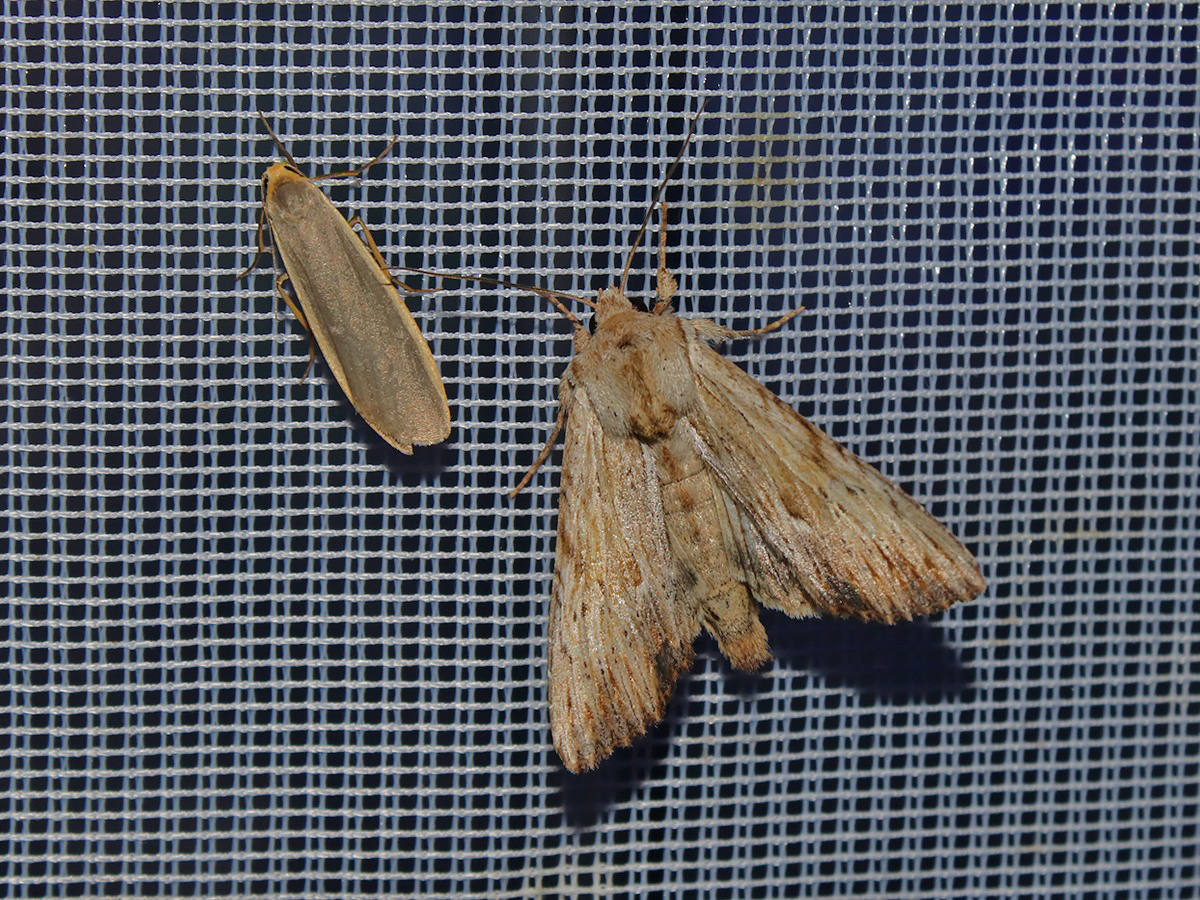 Die Weißlichgelbe Grasbüscheleule (Apamea lithoxylaea) ist gelbbräunlich gefärbt und weist keinerlei den Eulen typische Makel auf. Die Raupen dieser ungefährdeten Art fressen an verschiedenen Gräsern.